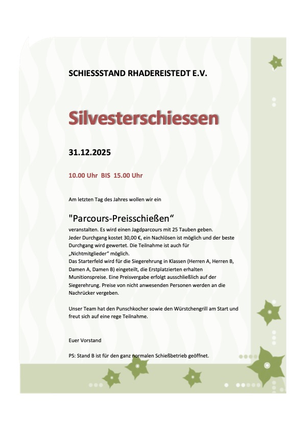 Wir freuen uns, Sie auf dem Schießstand Rhadereistedt e. V. begrüßen zu dürfen.